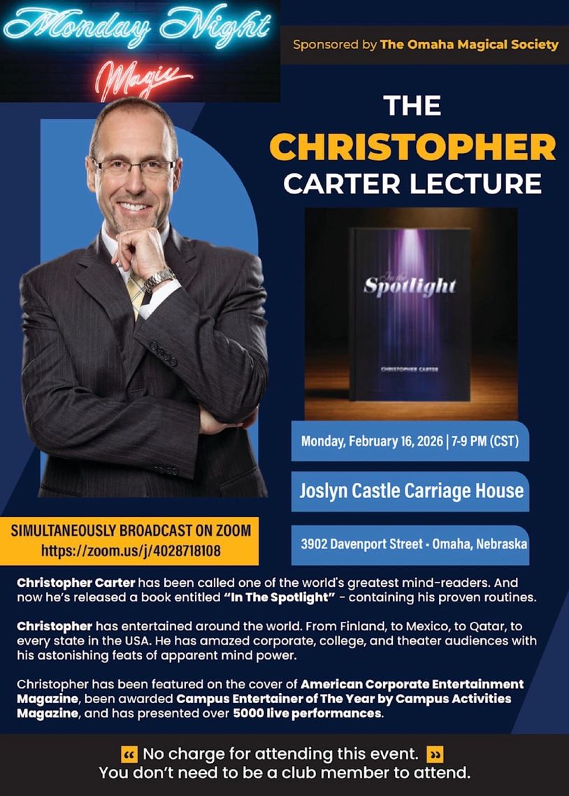 The Omaha Magical Society sponsors Monday Night Magic with a learn-a-trick section, prizes, and more on the third Monday of every month from 7:00 - 8:00 PM at The Joslyn Castle Carriage House (3902 Davenport Street in Omaha) with simultaneous broadcast on Zoom.